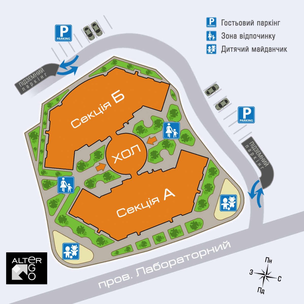 ЖК Alter Ego – це дві 24-поверхових секції, з'єднані між собою просторою дворівневою вхідною групою. У підземній частині комплексу розміститься паркінг на 196 паркомісць, а на облаштованій території заплановані дитячі майданчики і зони відпочинку.